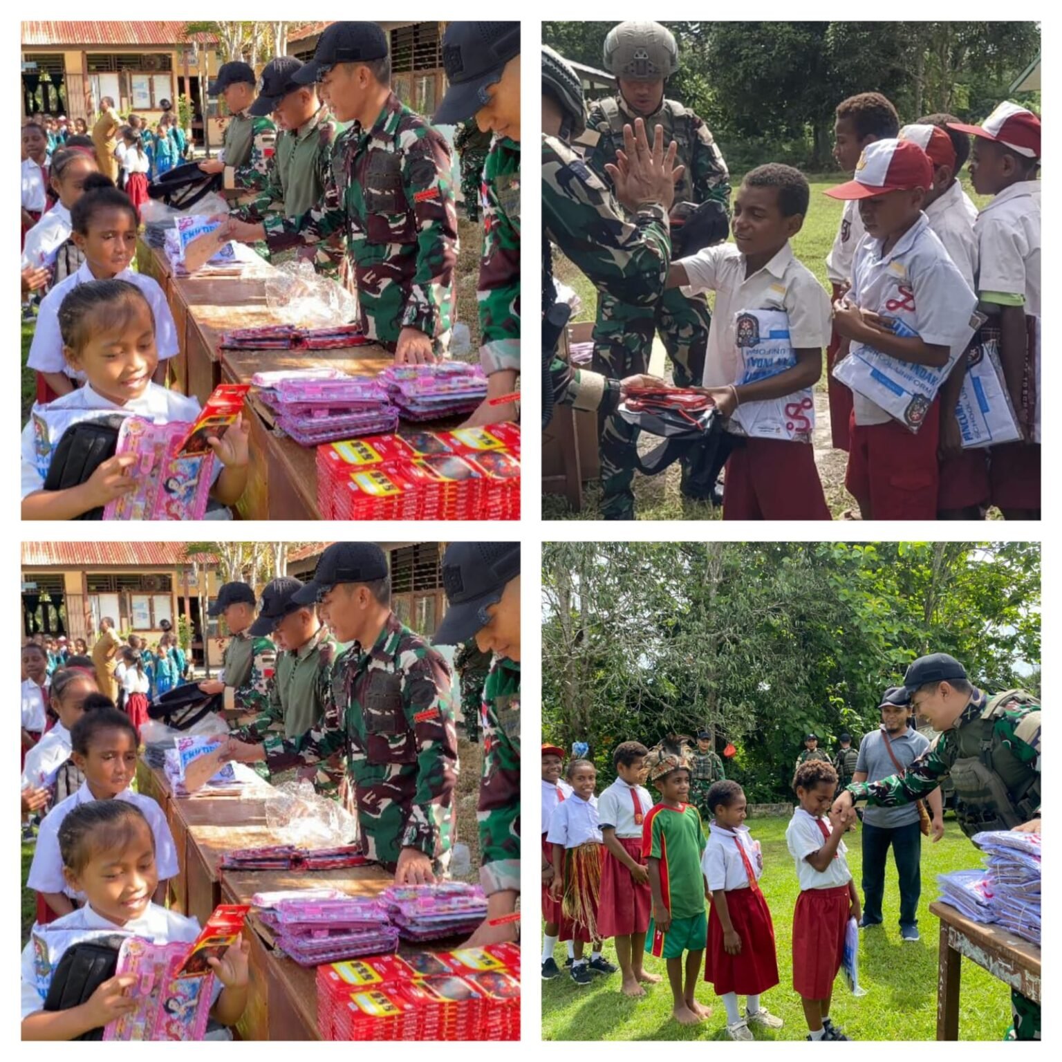[ KEEROM ] -Media Gendang Sumba.Com Personil Satgas Yonif 643/Wns Pos Kotis, Pos Wembi, Pos Waris dan Pos Kaliasin melaksanakan kegiatan pembagian seragam sekolah, tas, alat tulis kantor (ATK) dan pensil warna kepada siswa-siswi Sekolah Dasar (SD) di wilayah binaan sebagai bentuk kepedulian terhadap dunia pendidikan, Kab. Keerom, Prov. Papua, Rabu (28/1/2026).